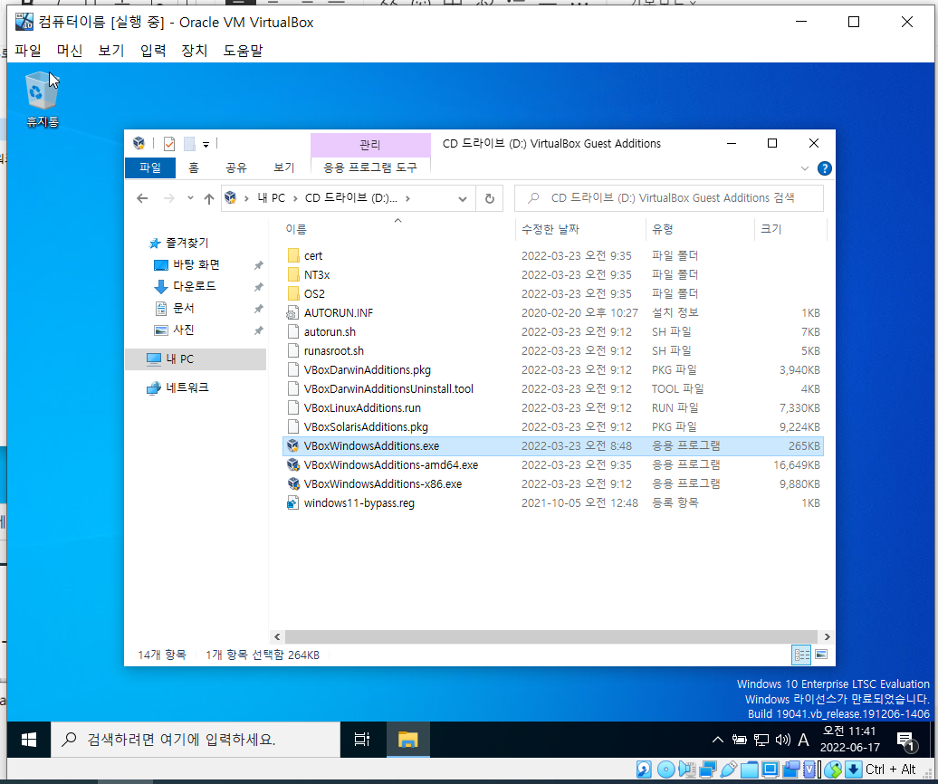 메뉴바 - 장치 - 게스트 확장 CD 이미지 삽입 클릭