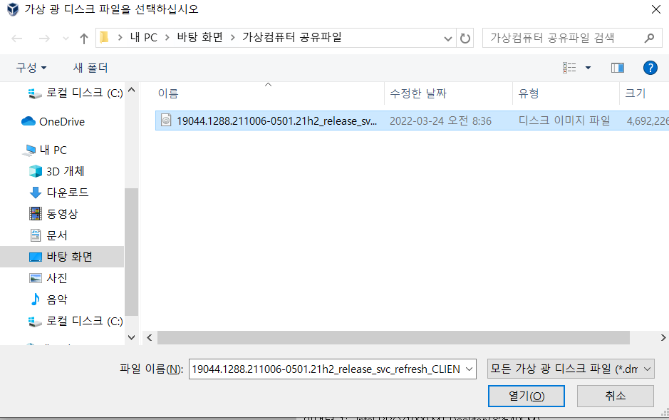 '광학 드라이브 비어있음' 클릭해서 디스크 파일 선택