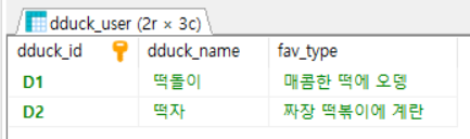 INSERT INTO dduck_user VALUES ('D2','떡자','짜장 떡볶이에 계란');