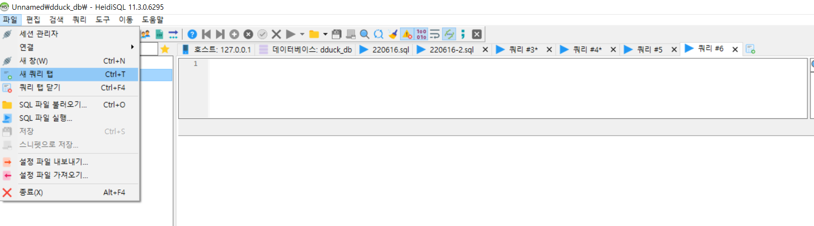3. (쿼리창에 입력) 데이터베이스 만들기 + 선택 실행